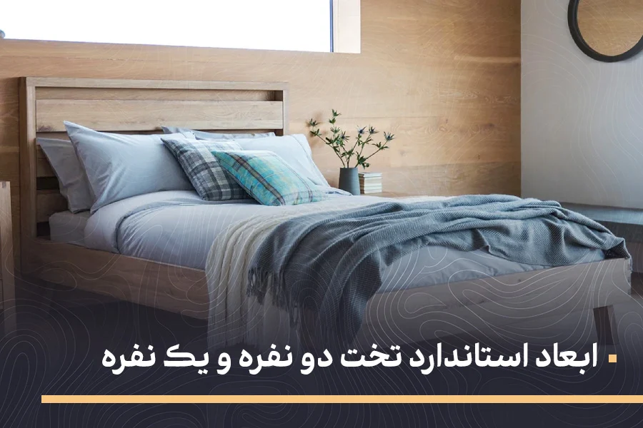 ابعاد استاندارد تخت دو نفره و یک نفره بسته به نوع کاربرد، متریال به کار رفته در ساخت تخت خواب و از همه مهمتر مدل و طراحی تخت خواب کاملاً متفاوت است؛ ولی به طور کلی ابعاد تخت دو نفره ۱۶۰ در ۲۰۰ سانتیمتر و یا ۱۸۰ در ۲۰۰ سانتیمتر در نظر گرفته میشود که در بیشتر مواقع حدود چند سانتیمتر این ابعاد کمتر و یا بیشتر میشوند.